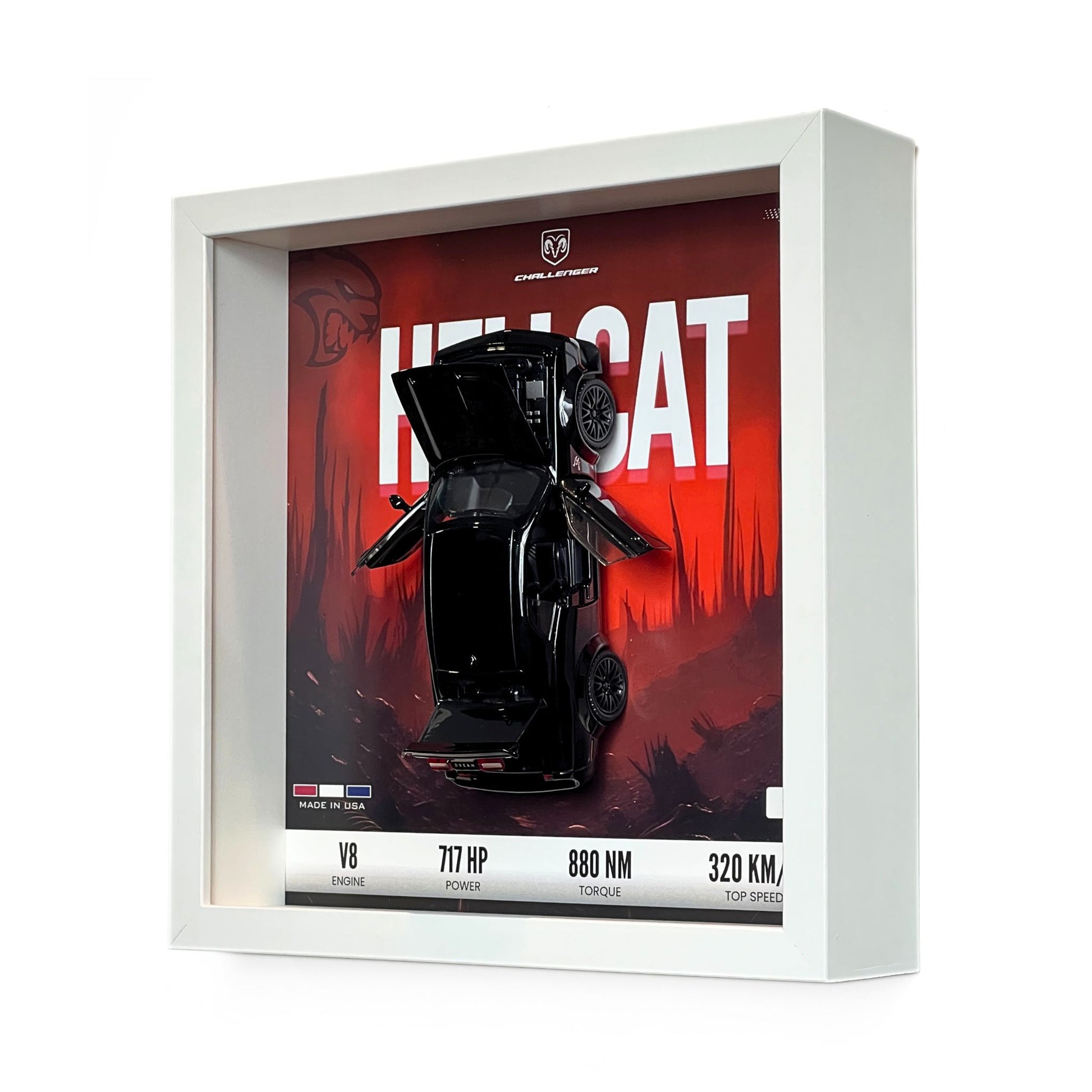 Experience unmatched craftsmanship with a 6cm deep 27×27 cm square frame with 300gsm high quality art paper. Protected by crystal-clear, shatter-resistant glass, your 1:32 diecast car is magnetically mounted—every detail designed for display, admiration, and effortless interaction.
